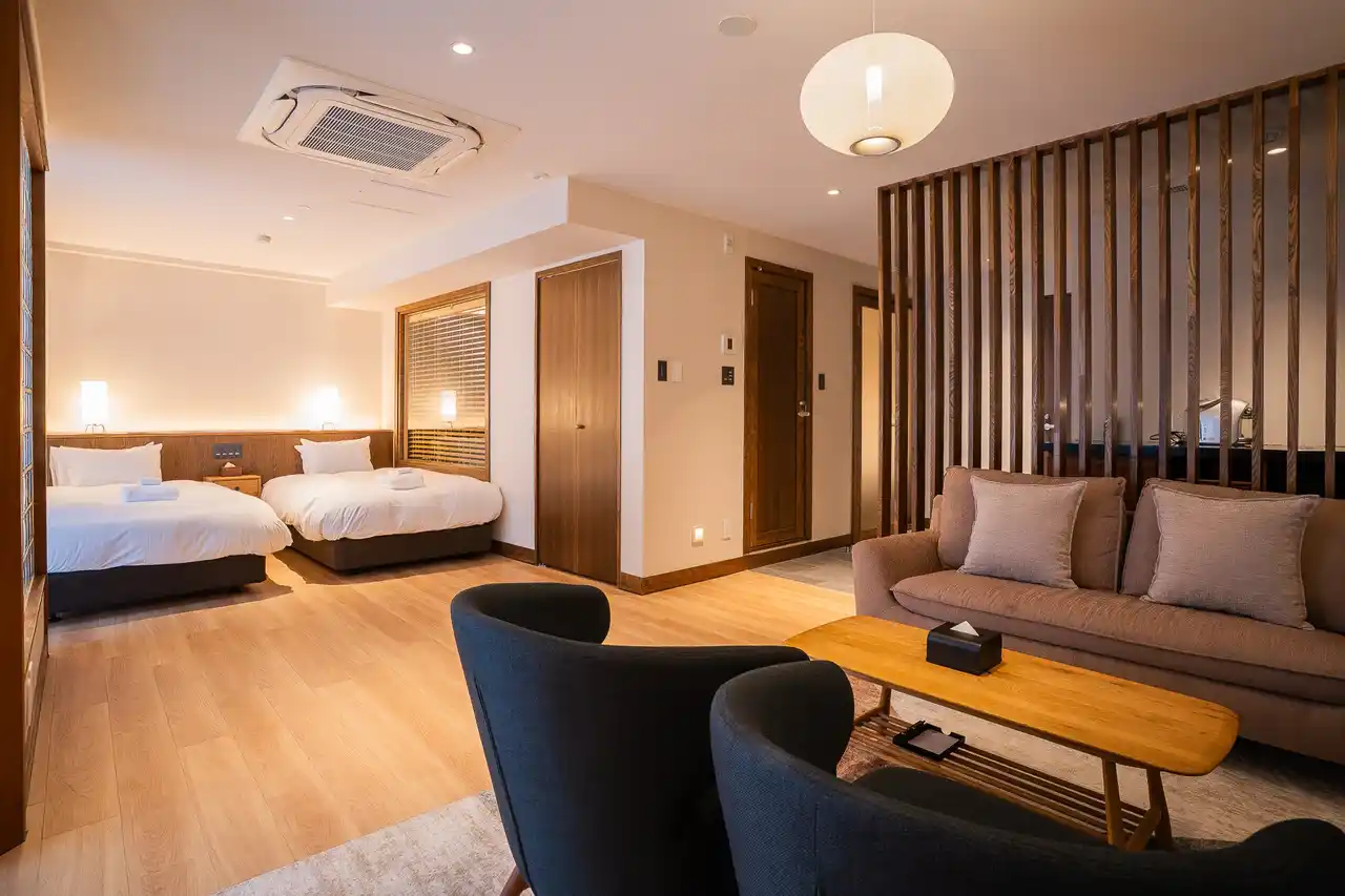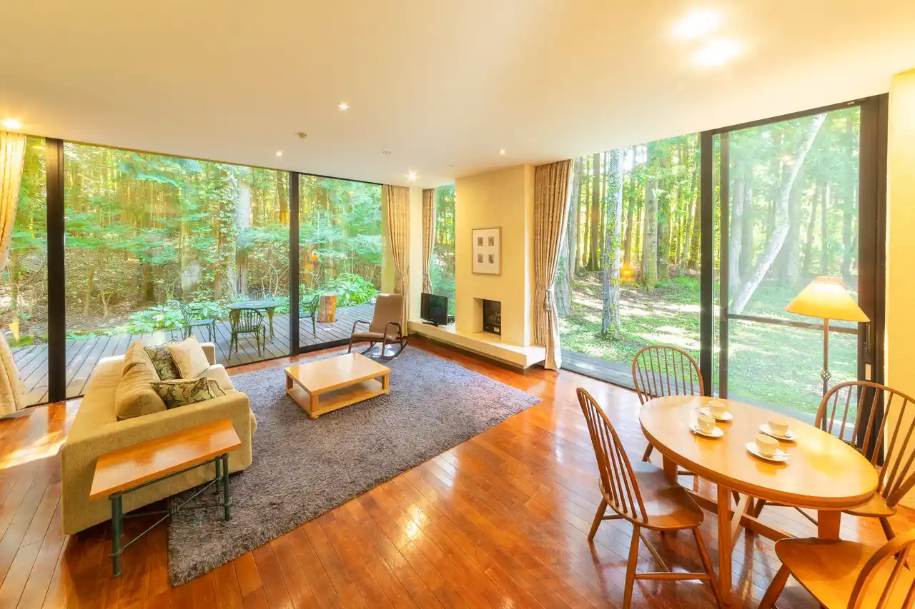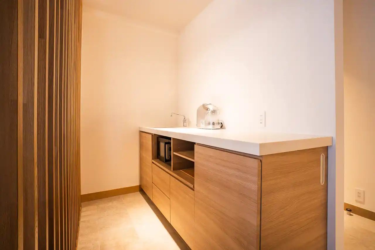 3. 66平方メートル 以上の開放感、長期滞在も叶う「森の邸宅」仕様 全室66平方メートル 以上のゆとりある間取りに2ベッドルームを配し、最大5名様まで宿泊可能。最新家電を備えたミニキッチンを完備し、快適な連泊が可能です。 |