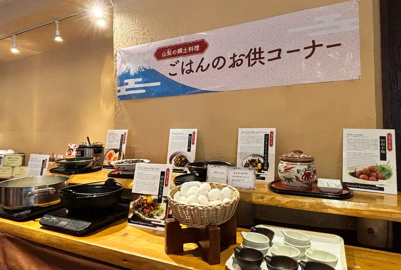 | 五感で味わう山梨: ほうとうや鳥もつ等の郷土料理から、自家製ポークハム、ホテル特製ローストビーフなど素材にこだわった逸品が並びます。ヒルナンデス!の放映においても取り上げられたお料理をご賞味ください。 | ||||||||||||||
