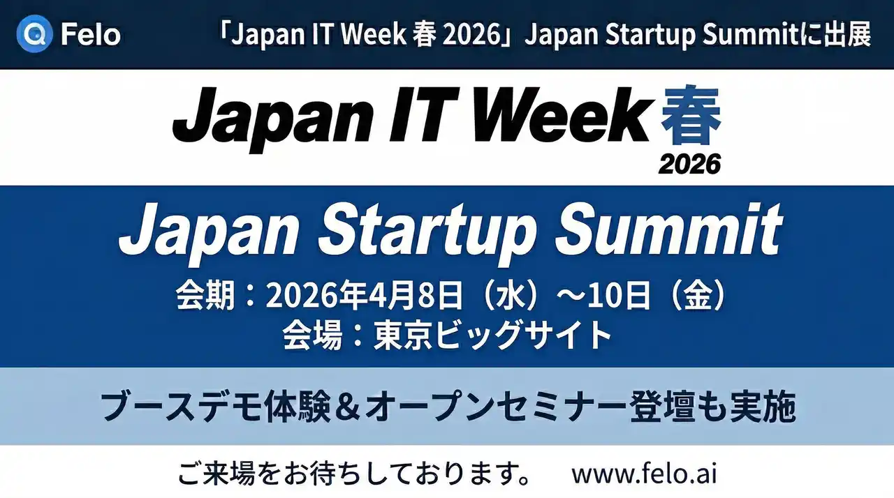 AI検索・生成AIプラットフォーム「Felo(フェロー)」を提供するFelo株式会社(本社:東京都千代田区)は、2026年4月8日(水)~10日(金)に東京ビッグサイトで開催される日本最大のIT・DX・AI総合展「Japan IT Week 春 2026」内の特別企画「Japan Startup Summit」(ブース番号:東3ホール S36)に出展いたします。 |