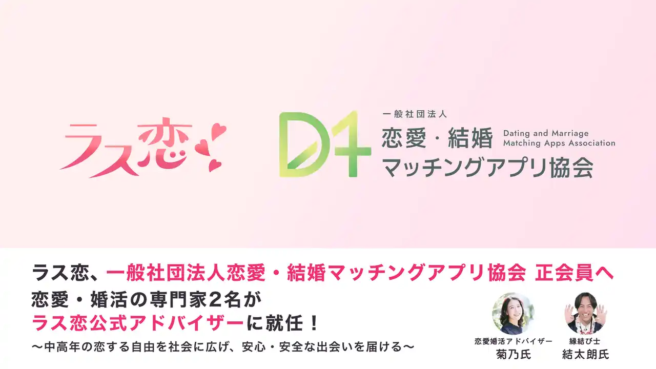 人生経験でつながるマッチングアプリ「ラス恋」を運営する株式会社ラス恋(本社:東京都渋谷区/代表取締役CEO:山口 昂星)は、2026年4月1日、一般社団法人恋愛・結婚マッチングアプリ協会(以下、DMMA)において、その運営実績やセキュリティ対策が基準を満たしたことから、会員種別が正会員Bへ変更となりました。