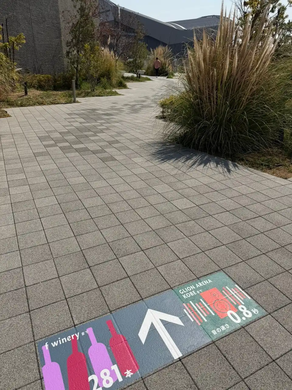 各施設に、ただ「歩いて」向かうだけではなく、目的地まで「ペンギンが泳ぐと45秒」「ワイングラス712杯」といった、この街ならではのユーモアを足もとに描くことで、歩くことが楽しく、会話が弾む時間として楽しんでいただくことを意図しています。また、目的地であった施設以外にもニューシーポートエリアにある他の施設のことを、サインを通じて知っていただき、エリア全体の回遊性向上も期待しています。 |