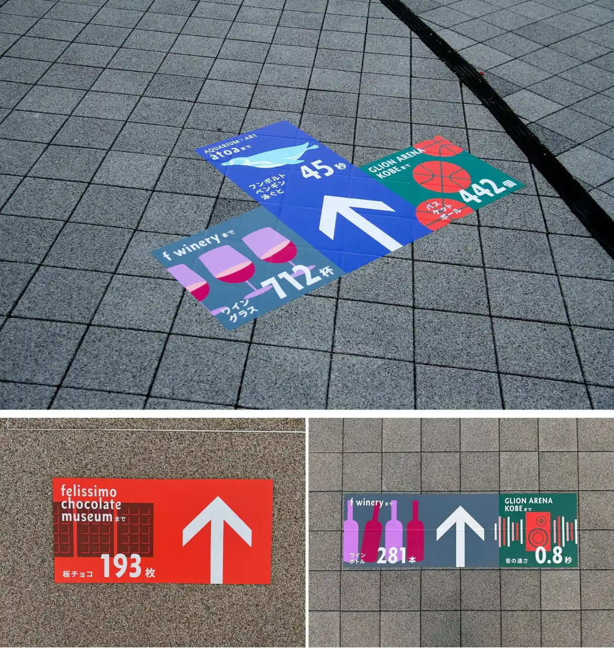 一般的な「徒歩○分」という表記ではなく、「水族館(atoa)入口までペンギンが泳ぐとあと45秒」「ワイナリー(f winery)までワインボトル281本分」といった各施設の特徴を活かしたユニークな距離指標は、直感的に距離を想像でき、実際に歩いて距離を体感してみたくなる仕掛けを採用しました。路面サインは文字情報を最小限に抑え、お子さまから観光客まで直感的に楽しめるデザイン。