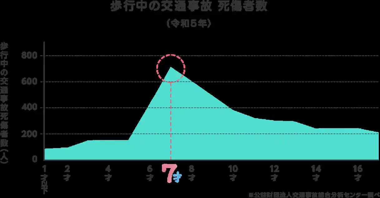 小学校にあがり行動範囲が広がる7才児は、大人よりも目線が低く、まだ十分に注意力が育まれていないために、交通事故による死者数が突出して多いというデータがあります(公益財団法人交通事故総合分析センター調べ)。当会では、このデータに着目し、未来ある子どもたちを交通事故から守るため、2019年1月から交通事故抑制に取り組んでいます。 |
