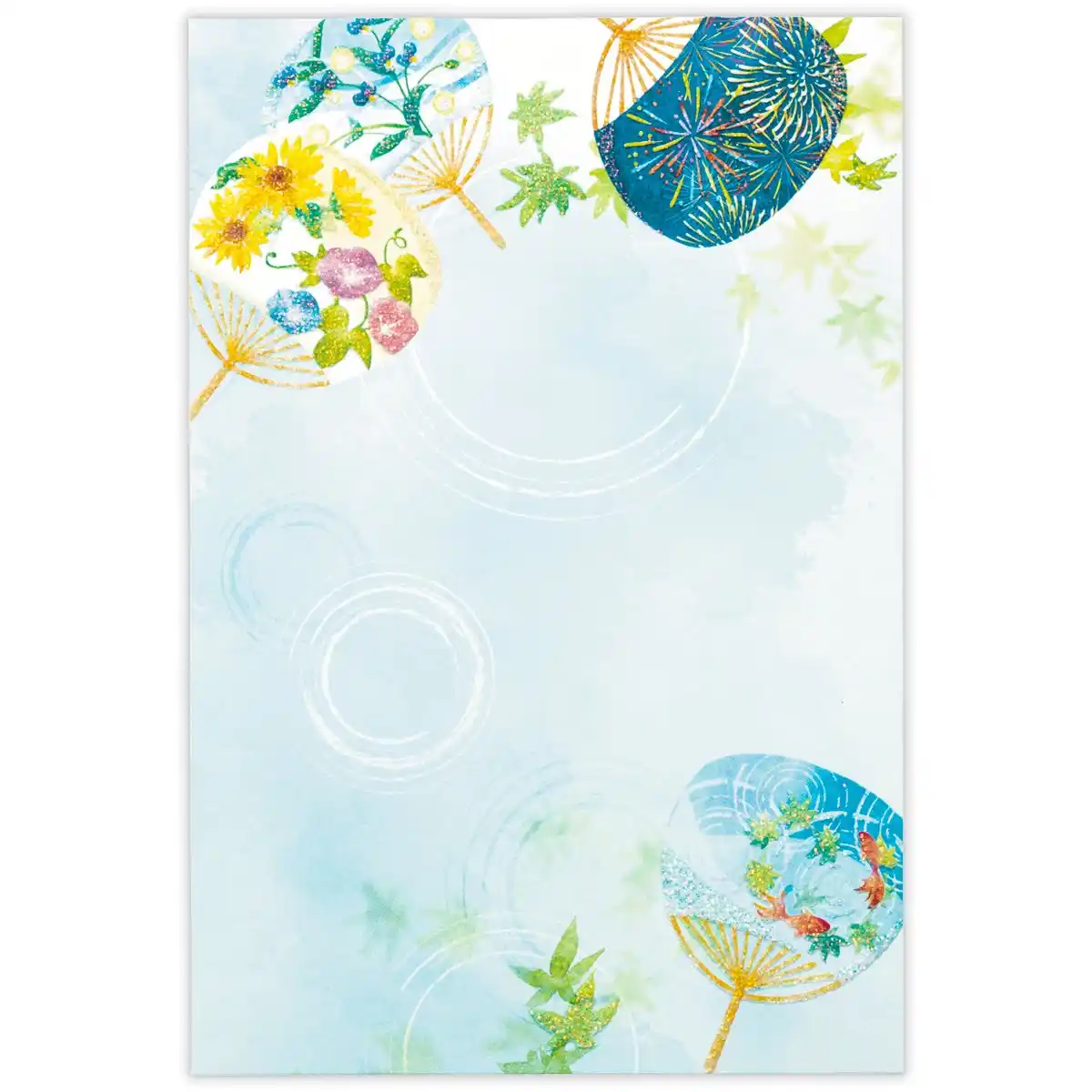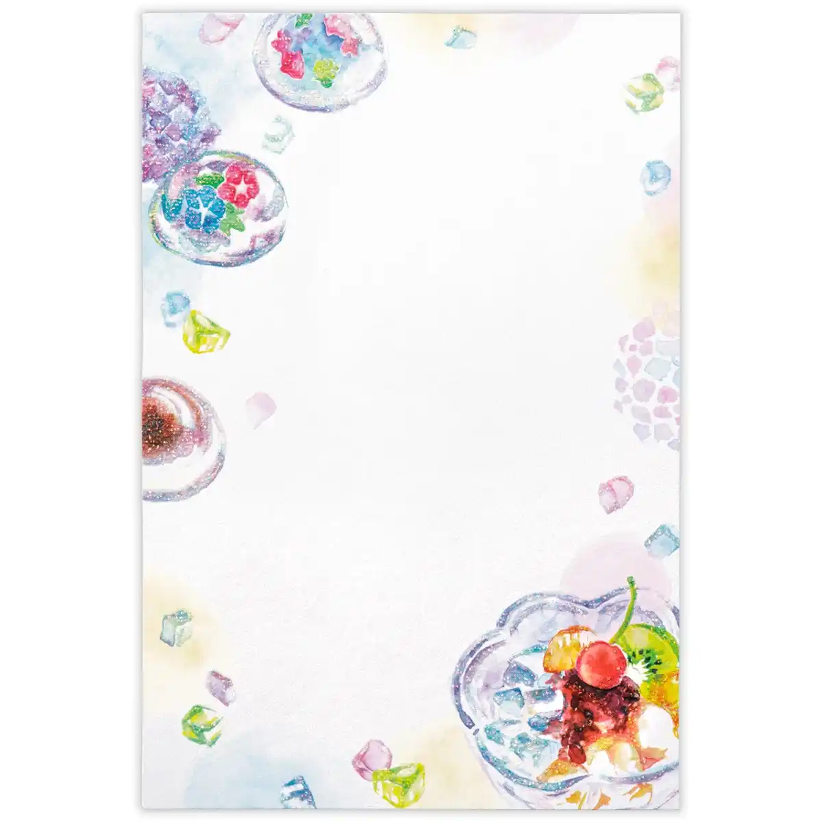 縦書きにも横書きにも書ける人気の罫線なしタイプは、風景印やスタンプの台紙として夏の思い出を残すのにもおすすめです。うちわの柄の中に夏らしいモチーフを詰め込んだ「うちわ」、透明感ある水まんじゅうやあんみつを描いた「夏菓子」の2柄。 |
