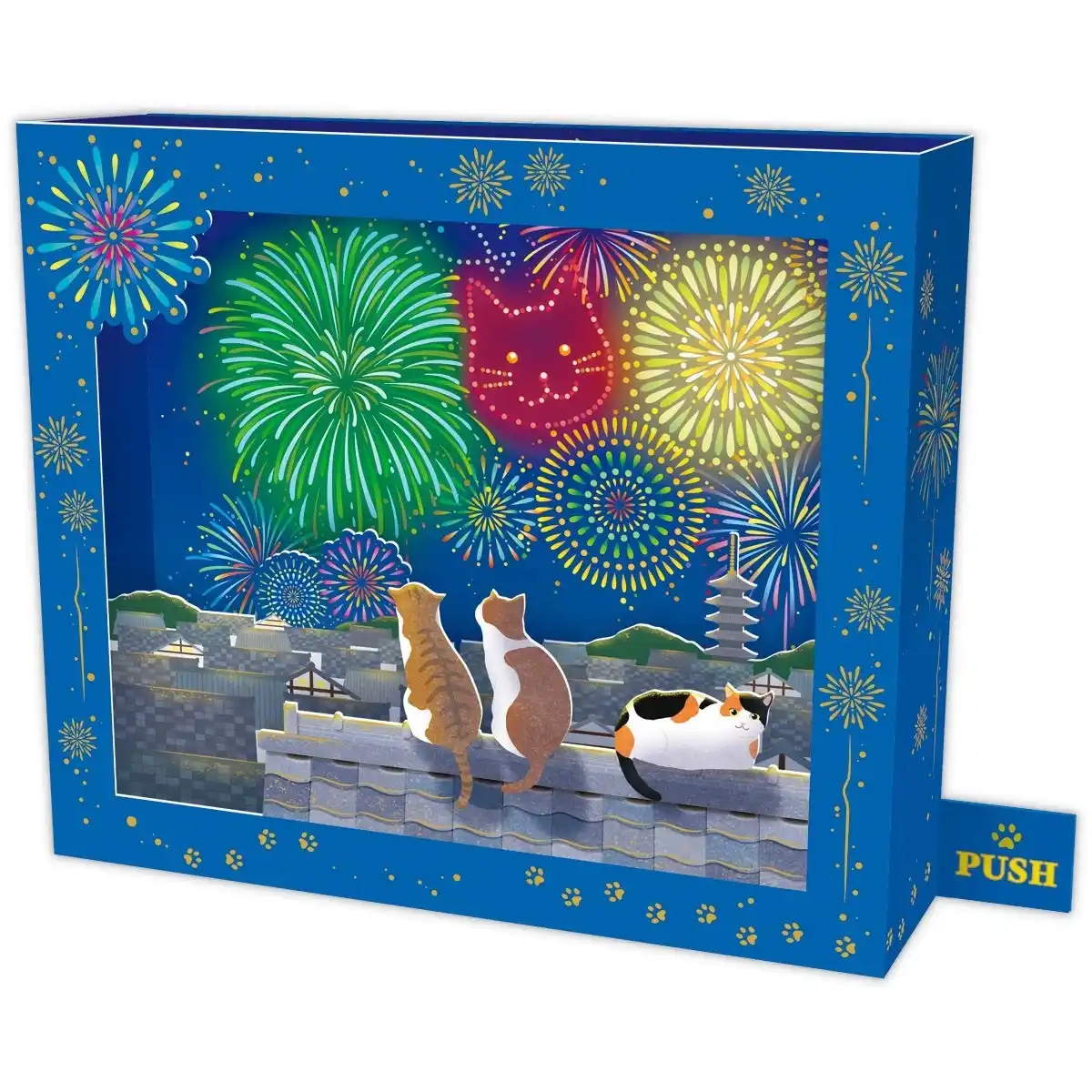 光と音による豊かな表現が魅力のLEDライト付きオルゴールカードに、通年人気の猫モチーフが登場! 夏の夜空を彩る花火と、愛らしい猫たちの後ろ姿がキュートなデザイン。猫の鳴き声と花火が打ち上がる音のほかに、夏を感じさせるどこか懐かしいオリジナルソングが楽しめる2曲入り。猫の顔型花火がポイントです。 |