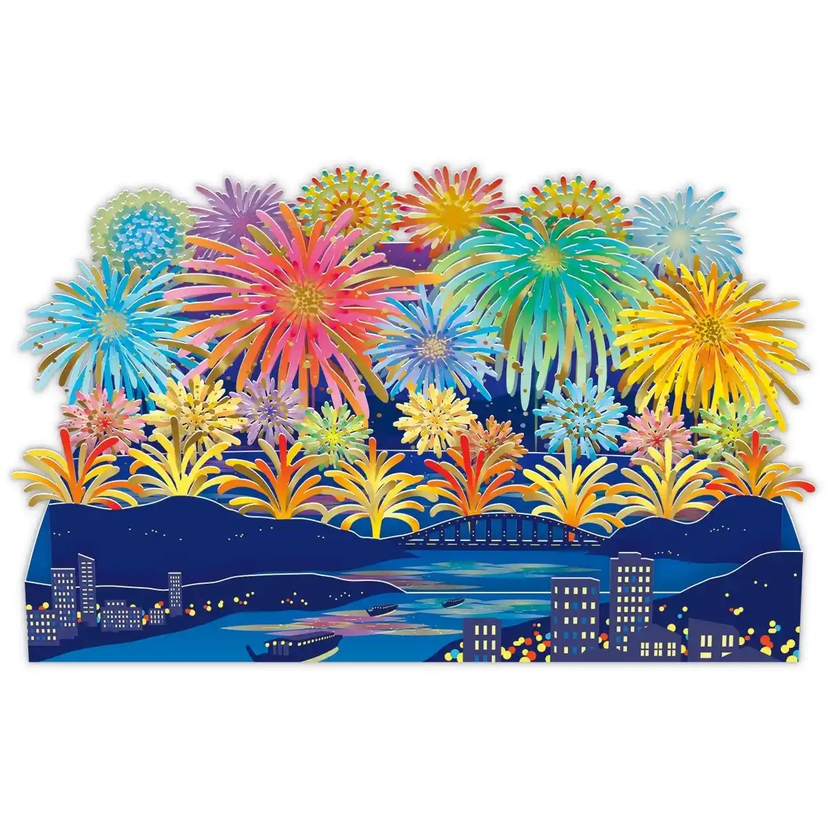 大規模な花火大会の迫力が立体カードに! 夜空いっぱいに広がるカラフルな花火を、繊細なレーザー加工で細部まで美しく表現。封筒にも花火モチーフをあしらい、パッケージ全体に奥行きと華やかさをプラスしました。 |