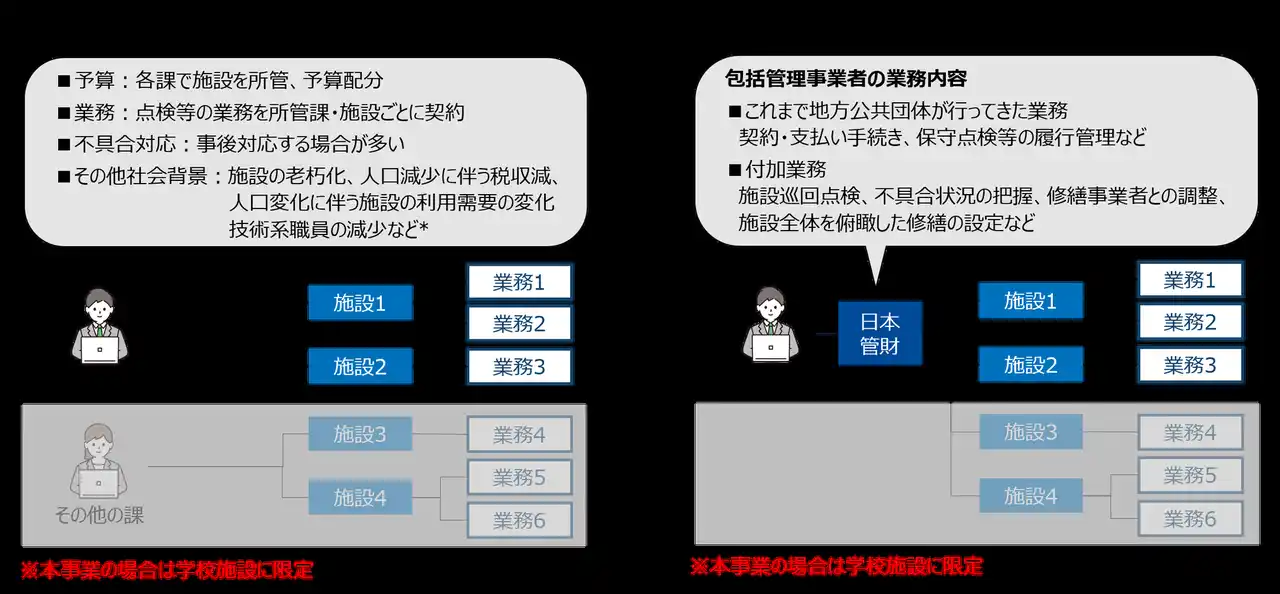 こうした行政課題に対応し、学校施設の維持管理水準を高め、教育環境を安定的に確保することを目的に、「公共施設包括管理」を導入することとなり、2025年12月から2026年3月にかけて公募型プロポーザルが実施されました。 |