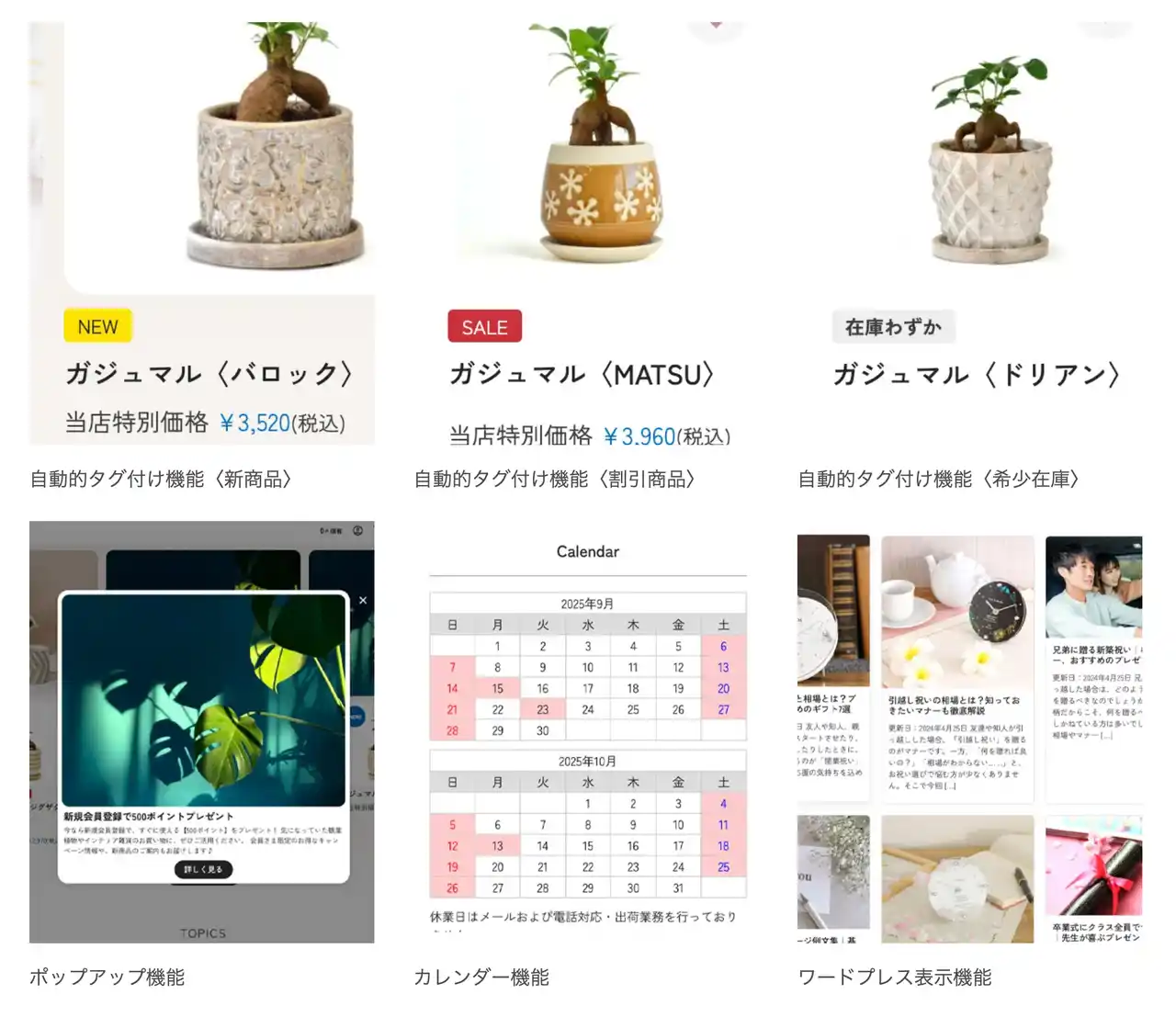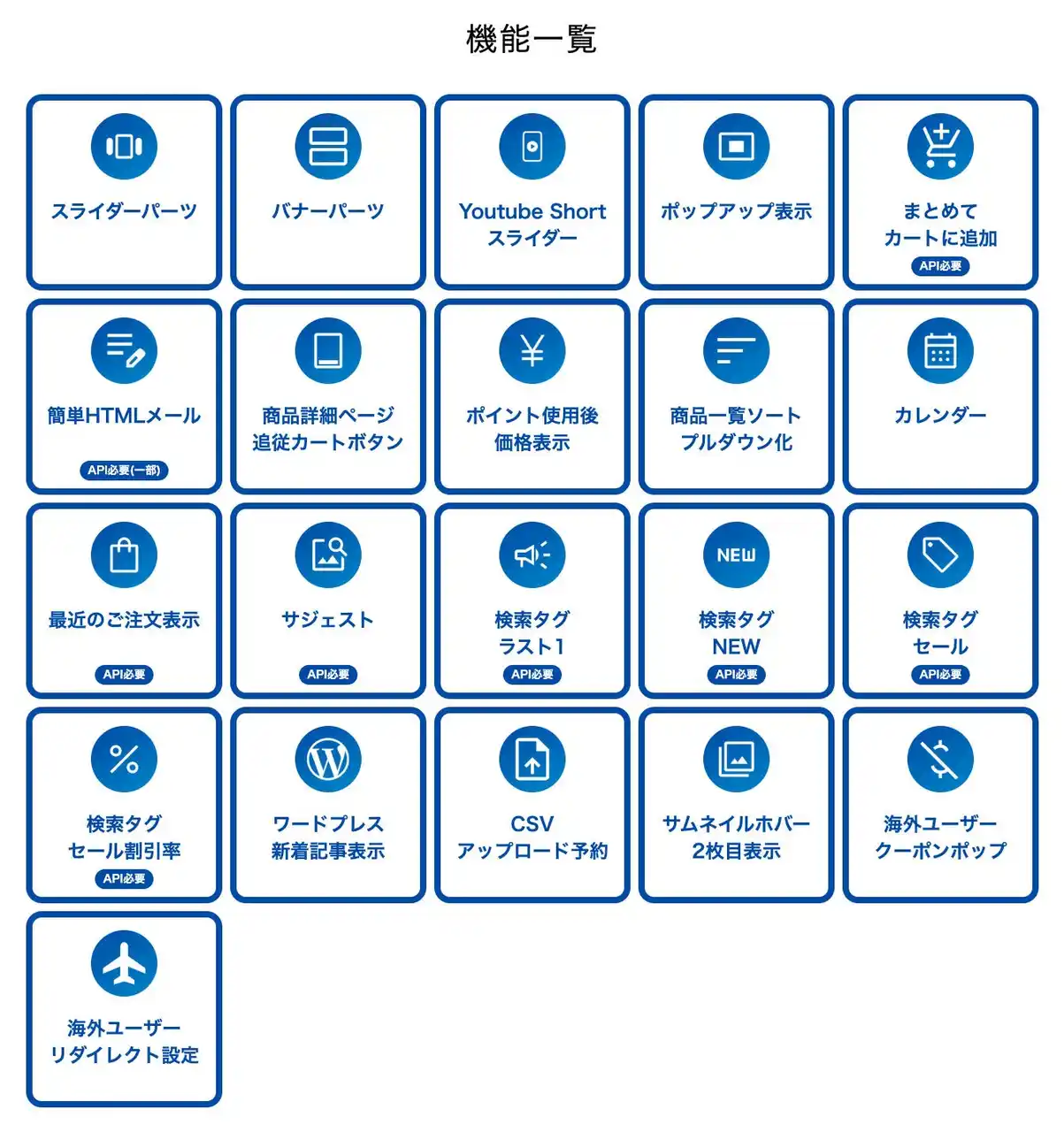 「NEW」「在庫わずか」などのタグ付与、ポップアップ表示、カート導線改善、海外ユーザー対応など、売上向上と運営効率化の両面に役立つ21の機能をひとつのサービスの中で利用できます。複数ツールの導入や管理の手間を減らしながら、ECサイト運営に必要な機能を活用することが可能になります。 |