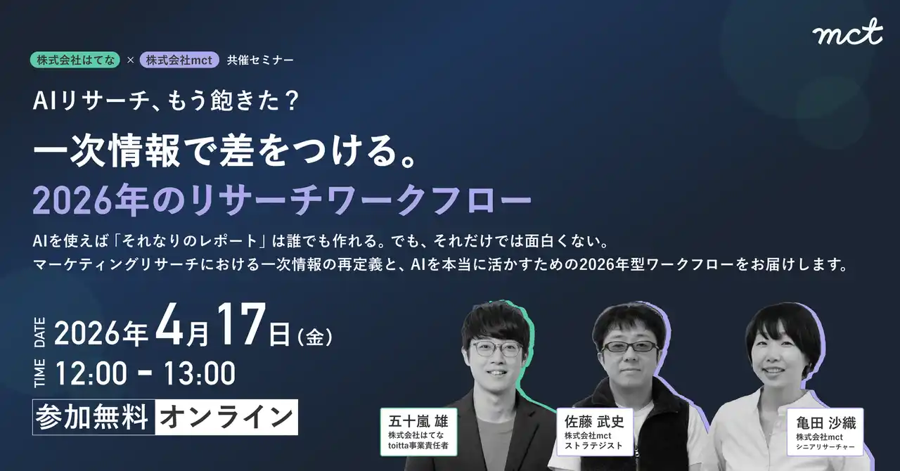 人間中心デザインとCX経営を支援する株式会社mct(本社:大阪市中央区、代表取締役:白根英昭、以下mct)と、コンテンツプラットフォームおよびB2Bマーケティング支援を展開する株式会社はてな(本社:京都市中京区、代表取締役社長:栗栖義明、以下はてな)は、2026年4月17日(金)に共催ウェビナー『AIリサーチ、もう飽きた?|一次情報で差をつける、2026年のマーケティングリサーチワークフロー』を開催することをお知らせいたします。 |