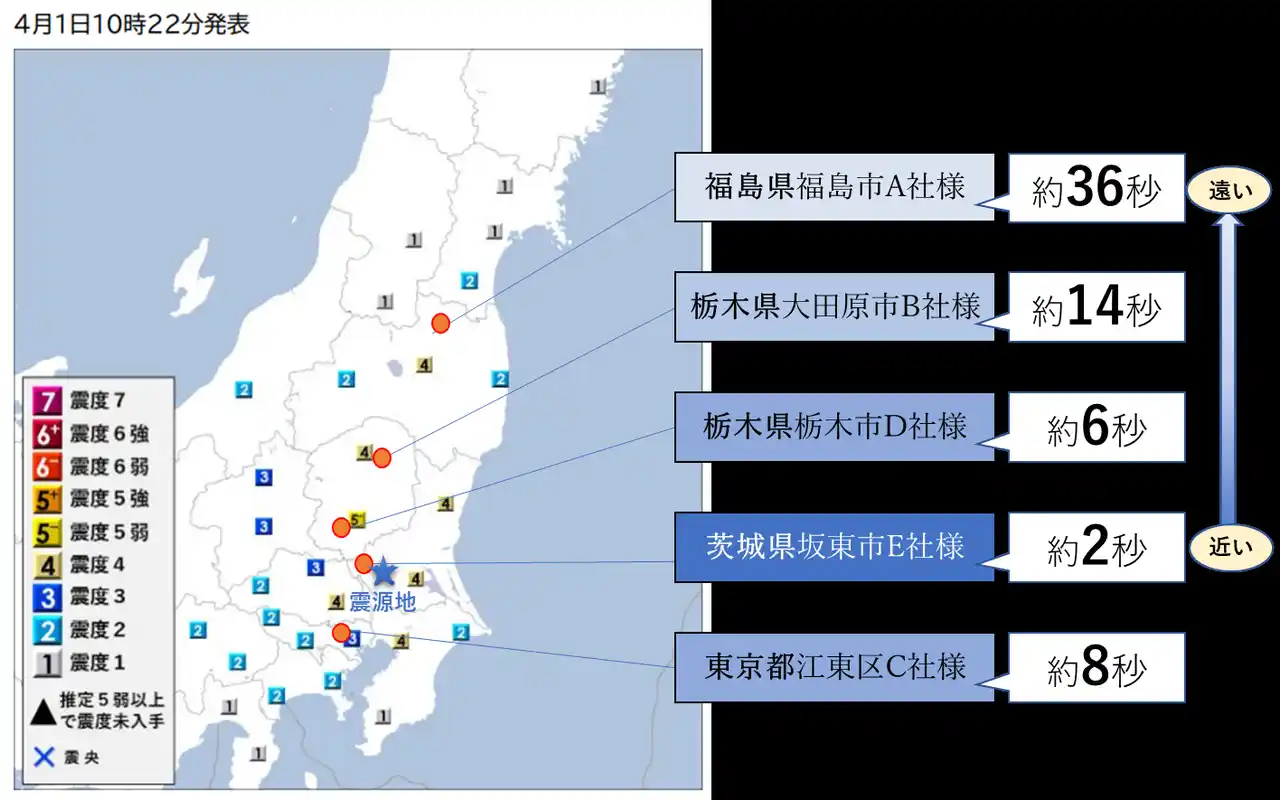 震源地に近い企業様の猶予秒数は短いですが、震源地から遠くなるにつれて猶予秒数は長くなっ |