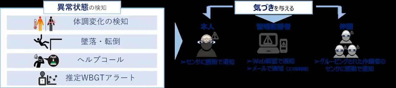 本システムは、バイタルデータによる体調変化の検知に加え、本人・グルーピングされた作業者や管理監督者へ即座に共有する通知機能も搭載。法改正への対応に適した作業者見守りソリューションとして、2026年度の販売分を開始いたしました。 |