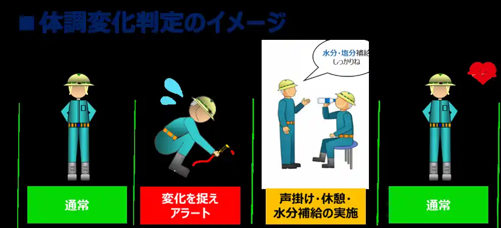 本人が自覚する前にアラートを出すことで、実効性のある休憩や水分補給の促進をサポートします。 |