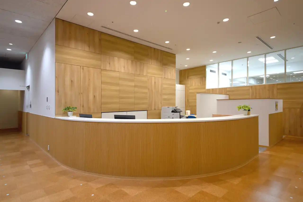 「タンボア」は、平面から曲面まで施工可能な壁装材です。基材に天然木のツキ板を施したリズミカルな断面形状で、天然木の風合いを立体的に表現します。曲面のカウンター側面への使用に加え、不燃認定取得のタイプは壁面全体への施工も可能で、ホテルやオフィス、受付などに幅広く採用されています。 |