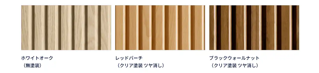 このたび追加された「V溝」は、不燃タイプで人気の形状とほぼ同形状とし、非不燃タイプとして全3色をラインアップしました。この形状は、曲面であってもスリット部まで木目が途切れることなく続き、継ぎ目のない美しい仕上がりを実現します。約6mmのスリットによる深い陰影が空間にダイナミックな表情と高級感をもたらし、腰壁やカウンター側面の仕上材として高い意匠性を発揮します。 |