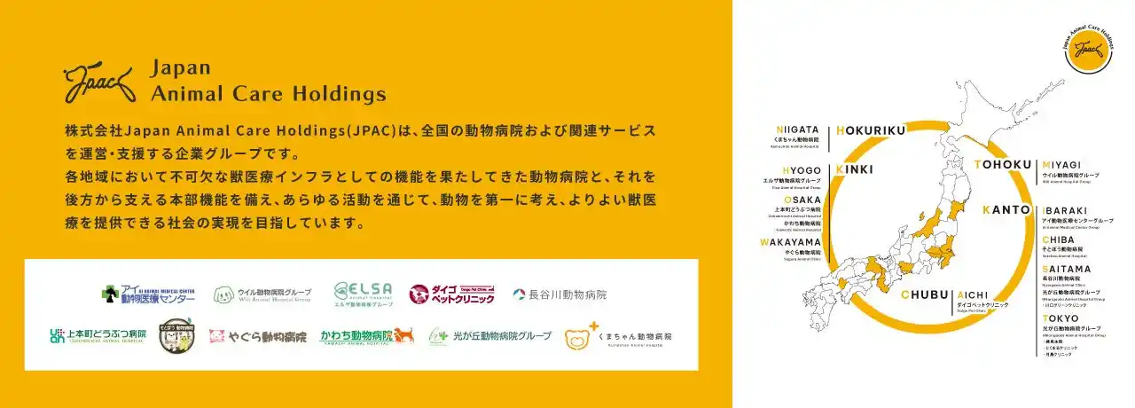 株式会社Japan Animal Care Holdings(JPAC)は、全国の動物病院および関連サービスを運営・支援する企業グループです。 各地域において不可欠な獣医療インフラとしての機能を果たしてきた動物病院と、それを後方から支える本部機能(動物医療の質向上、人材育成の充実、経営支援、デジタル化推進など)を備えており、あらゆる活動を通じて、動物を第一に考え、よりよい獣医療を提供できる社会の実現を目指しています。 |