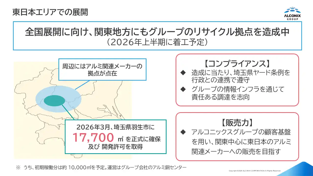 非鉄金属スクラップの回収・選別・保管というインフラ機能へ投資することで、脱炭素促進・環境負荷の低減に加え、重要資源の安定供給基盤の強化にも貢献してまいります。特に、関東圏は非鉄金属スクラップの一大発生地であり、本件の造成地である羽生市周辺には潜在的な需要家であるアルミ関連メーカーが拠点を構えております。そこで、東日本エリアでのリサイクル事業を戦略的に強化するべく、本件の造成を決定しました。