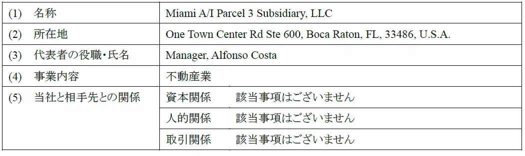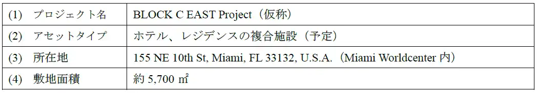 | 当社初の米国におけるプロジェクトとして、現地デベロッパーであるFalcone Group, LLC(本社:フロリダ州)が主導するMiami Worldcenterにおける区画の開発用地を取得いたしましたので、あわせてお知らせいたします。 | |||