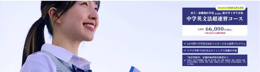 ━━━━━━━━━━━━━━━━━━━━━━━━━━ 【新中1対象】6ヶ月で中学英文法を完全習得-最難関大・医学部を見据えた「中学英文法超速習コース」開講 ━━━━━━━━━━━━━━━━━━━━━━━━━━ |
