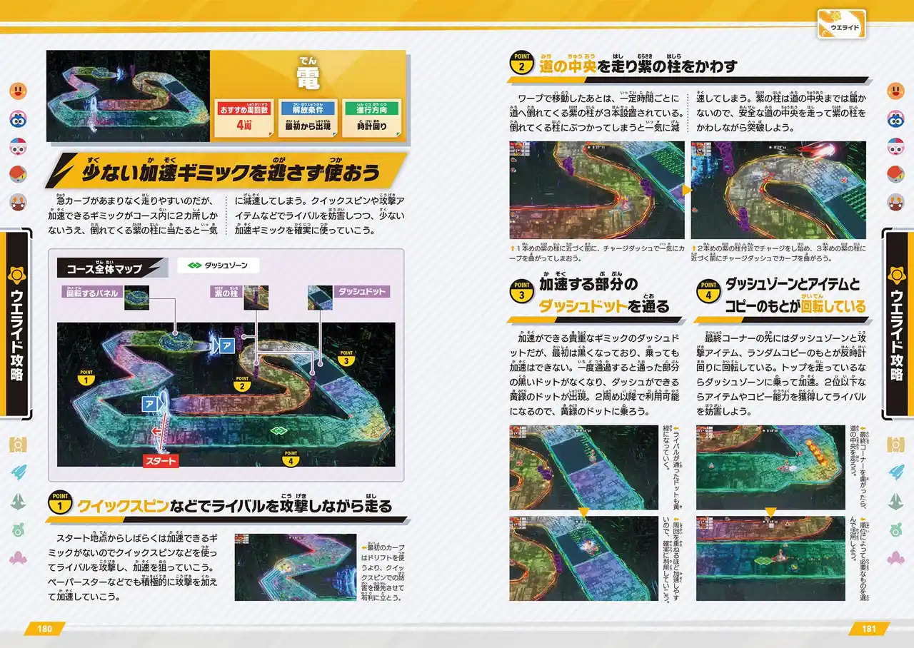 上空からの見下ろし視点でコース全体を把握しながら、ライバルとのレースを楽しめる「ウエライド」モードの全9コースを攻略。コースマップではスピードアップの決め手となるギミックを掲載し、コース上で加速や追い抜きのポイントとなるコーナーやギミックをピックアップして解説。 |