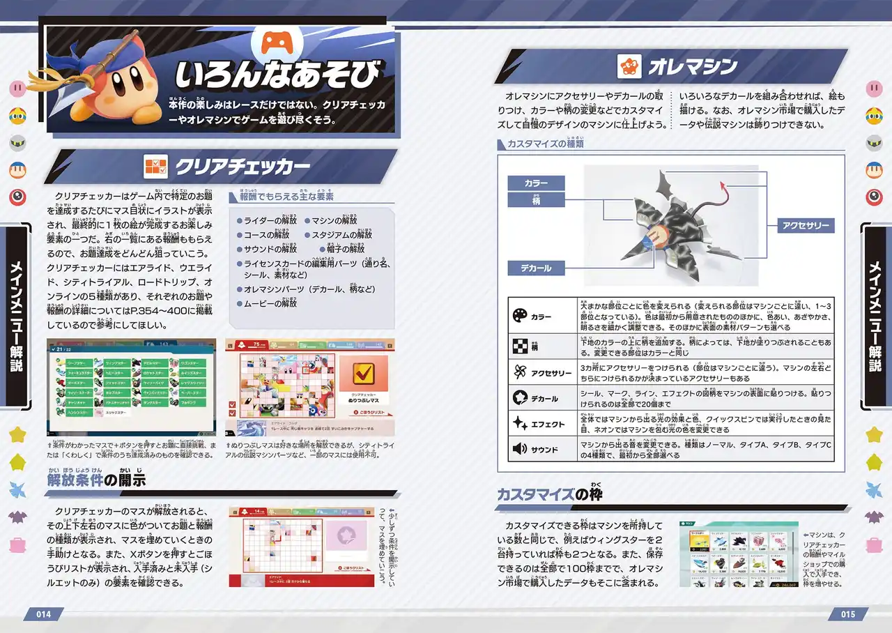 「エアライド」「ウエライド」「シティトライアル」「ロードトリップ」、すべてのゲームモードで、プレイヤーをサポートする究極の攻略情報を集約。さらに「クリアチェッカー」をはじめ、「オレマシンパーツ」「ライセンスカード」といった、やり込み&コレクション要素の入手条件も、すべてお見せします。 |