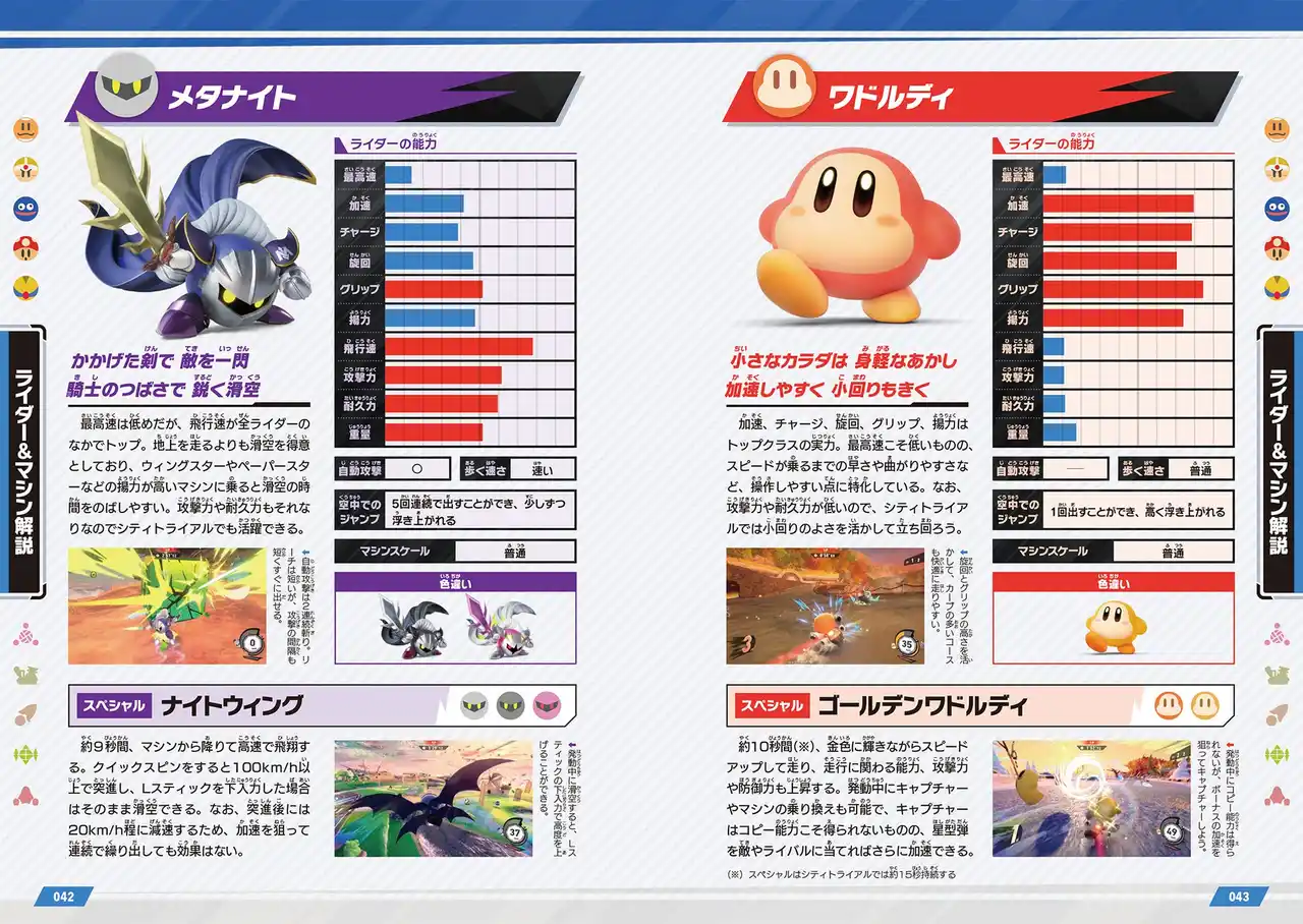 縦横無尽にコースを走って飛んで、敵やライバルを攻撃! マシンの操作をマスターして、最強最速のエアライダーを目指せ! 全21人のライダーと全28台のエアライドマシンの解放条件をぜんぶ見せ。ライダー&マシンの能力・性能のグラフで、個性や特徴がよくわかる。「カービィ」シリーズでおなじみ、全17種類のコピー能力もバッチリ。 |