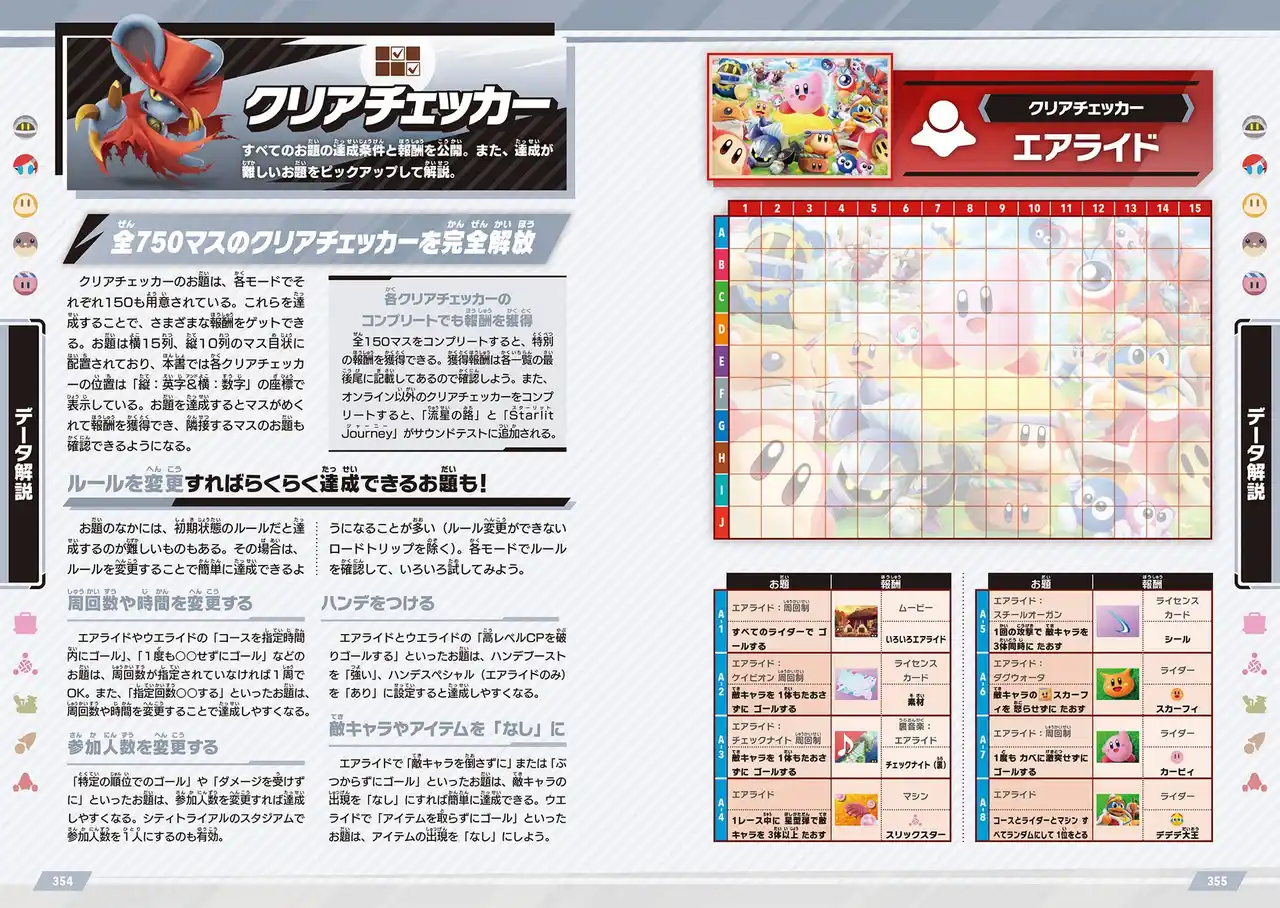 ライバルや敵を攻撃しながらマシンを加速させてトップを目指す「エアライド」モードの全18コースを徹底攻略。マシンを加速させる特殊なギミックの位置をコースマップ上に記載し、ライバルを攻撃するコピー能力を持つ敵キャラクターの出現情報も掲載。もちろんコース上でライバルに差をつけるためのポイントも解説。 |