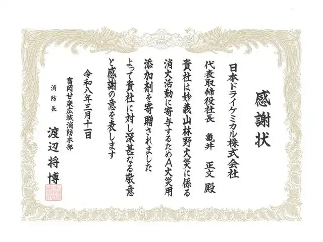 当社は、2025年12月8日に妙義山で発生した林野火災を受け、群馬県の富岡甘楽広域消防本部へA火災用添加剤「GreenWet(グリーンウェット)」を寄贈いたしました。 |