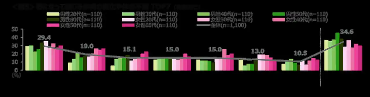 春になって感じる体の不調は、「花粉症」が29.4%で最も多く、「寒暖差による不調」が19.0%。 次いで「眠気・睡眠の乱れ」「目のかゆみ・充血」「だるさ・疲れやすさ」が続く。女性40~60代は「寒暖差による不調」「眠気・睡眠の乱れ」「だるさ・疲れやすさ」が高く、春バテを感じている傾向がみられる。<図5> |