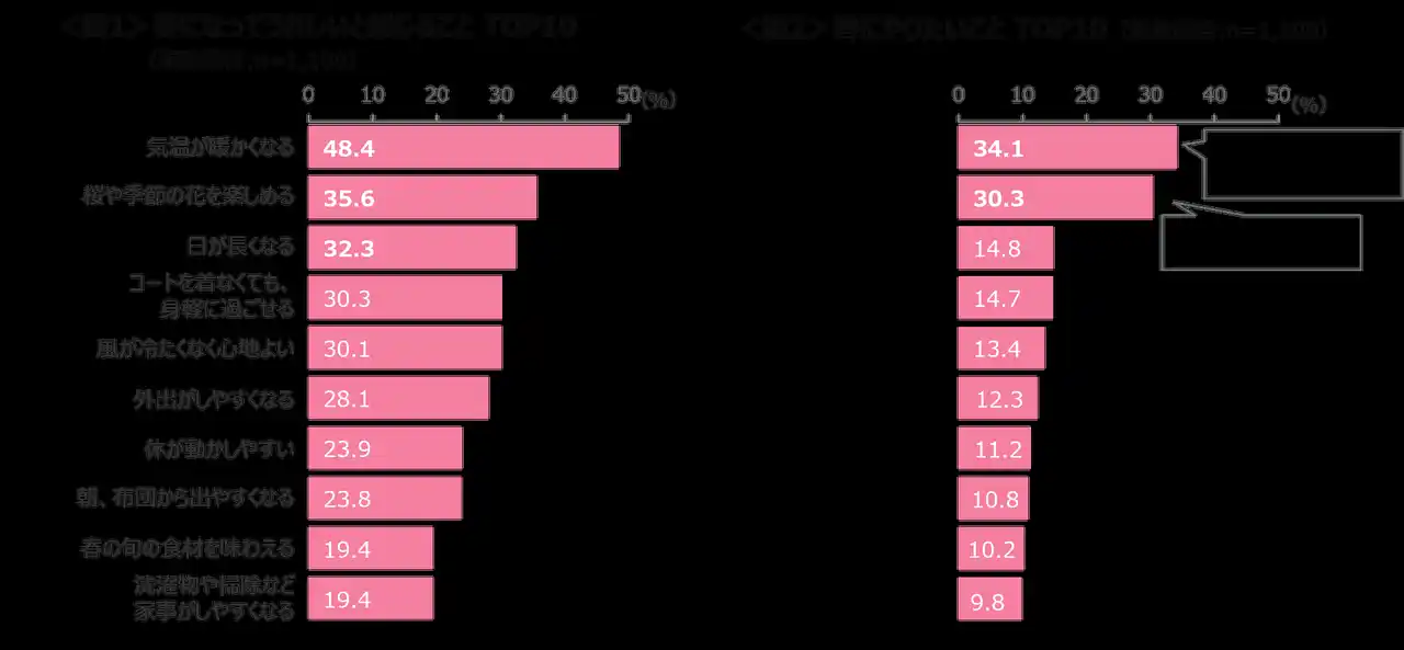 春になってうれしいと感じることは、「気温が暖かくなる」「桜や季節の花を楽しめる」「日が長くなる」が上位。<図1> |
