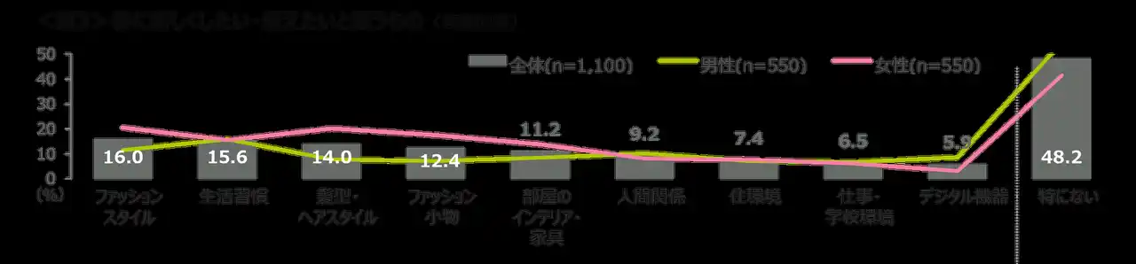 新しくしたい・変えたいと思うものは、「ファッションスタイル」「生活習慣」「髪型・ヘアスタイル」がTOP3。 女性は「ファッションスタイル」「髪型・ヘアスタイル」「ファッション小物」といった外見を整える意識が高め。<図3> |