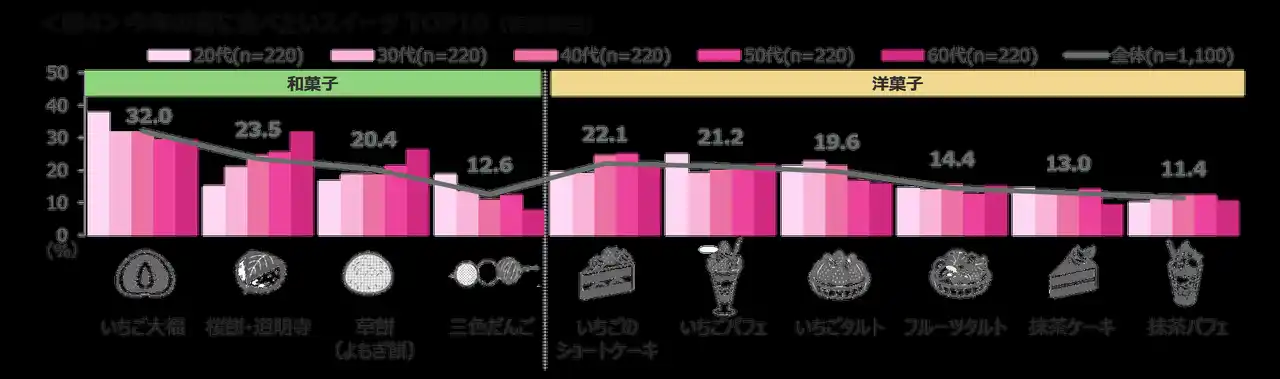今年の春に食べたいスイーツは、「いちご大福」が32.0%で最多。次いで、「桜餅・道明寺」「いちごのショートケーキ」「いちごパフェ」「草餅(よもぎ餅)」が2割台で続き、いちごを使ったスイーツが上位にあがる。 「いちご大福」「いちごパフェ」は20代で、「桜餅・道明寺」「草餅(よもぎ餅)」は60代で多い。<図4> |