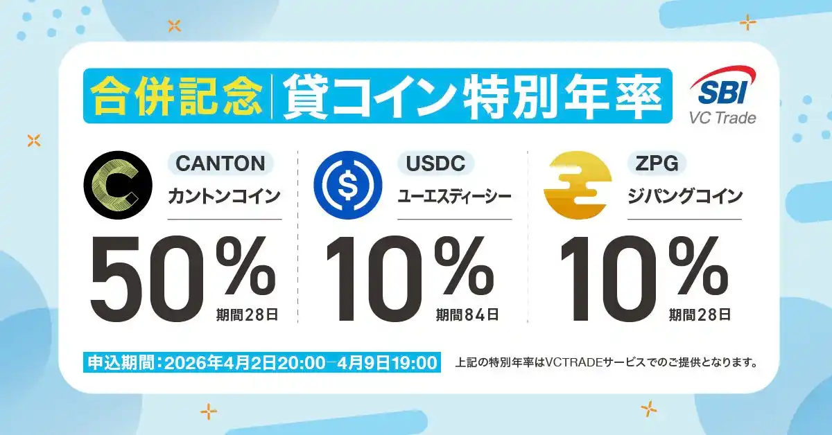 SBIホールディングス株式会社(本社:東京都港区、代表取締役会長兼社長:北尾 吉孝)の連結子会社で暗号資産交換業を営むSBI VCトレード株式会社(本社:東京都港区、代表取締役社長:近藤 智彦、以下「当社」)は、2026年4月2日(木)より、「【SBI VCトレード・ビットポイント合併記念】特別年率での貸コイン募集~一挙3銘柄!CANTON年率50%、USDC年率10%、ZPG年率10%~」の募集を開始します。 |