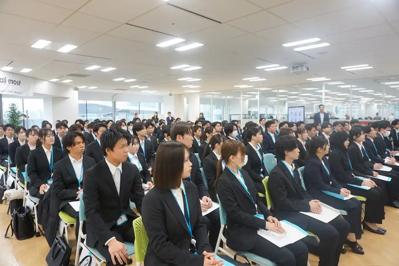 序盤は緊張した様子が見られた新入社員でしたが、先輩社員が会場に駆けつけ、「日々コツコツと努力を積み重ねることが成果につながる」「決して一人ではなく、周囲の仲間と支え合いながら成長していける」といった力強い言葉や、「お客様のことを第一に考えた先に、自分の成長や評価がついてくる」という想いが届けられると、徐々に表情も和らいでいきました。会場の雰囲気も次第に温まり、先輩社員から新入社員へと想いが引き継がれる中で、これから始まる社会人生活への期待が一気に高まりました。 |