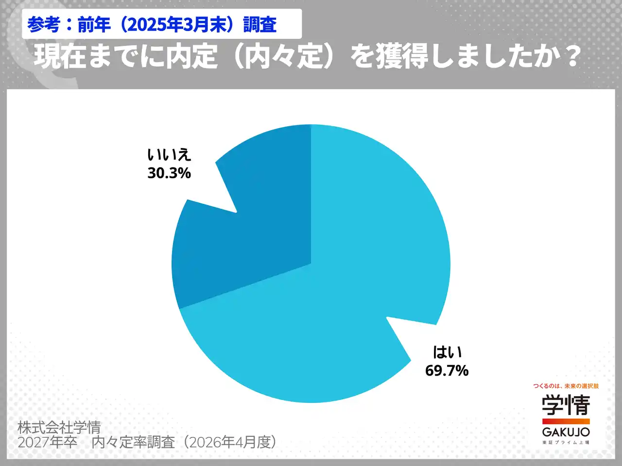 株式会社学情(本社:東京都中央区)は、2027年3月卒業(修了)予定の大学生・大学院生を対象に、最新の「内々定の獲得状況」についてインターネットアンケートを実施しました。 |
