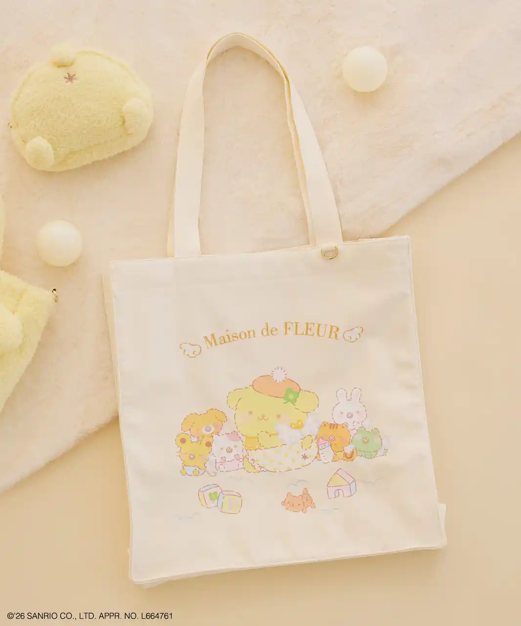 スクエアトートバッグには、ポムポムプリンとお友だちが集う愛らしいデザインをプリント。裏地には“チームプリン”の総柄を採用しました。フロントにはDカンを備え、お好きなチャームを取り付けてアレンジが可能です。 |