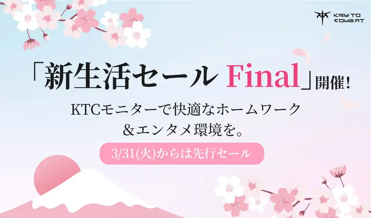 KEY TO COMBAT(以下KTC)は、ゲーミングモニターブランド「KTC」にて、春の大型キャンペーン 「新生活セール Final」 を、2026年3月31日(火)から4月6日(月) までの期間限定で開催中です。 |