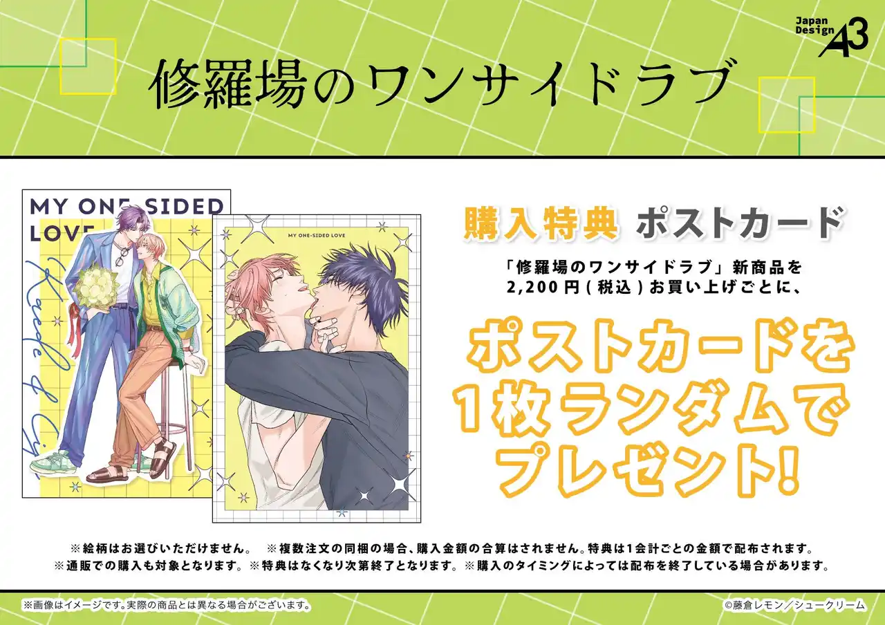 | 『修羅場のワンサイドラブ』新商品を1会計2,200円(税込)お買い上げごとに、購入特典としてポストカード(全2種)をランダムで1枚プレゼント!(※特典はなくなり次第終了) | |||||||||