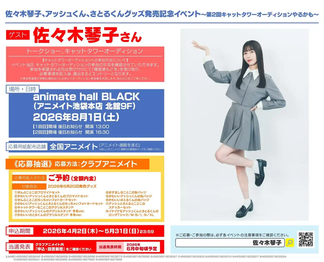 全国アニメイト・アニメイト通販にて2026年6月20日(土)発売の「佐々木琴子さん」グッズをご予約内金(通販は注文時の決済)3,000円(税込)毎にイベント応募シリアルを1つプレゼントいたします。 |