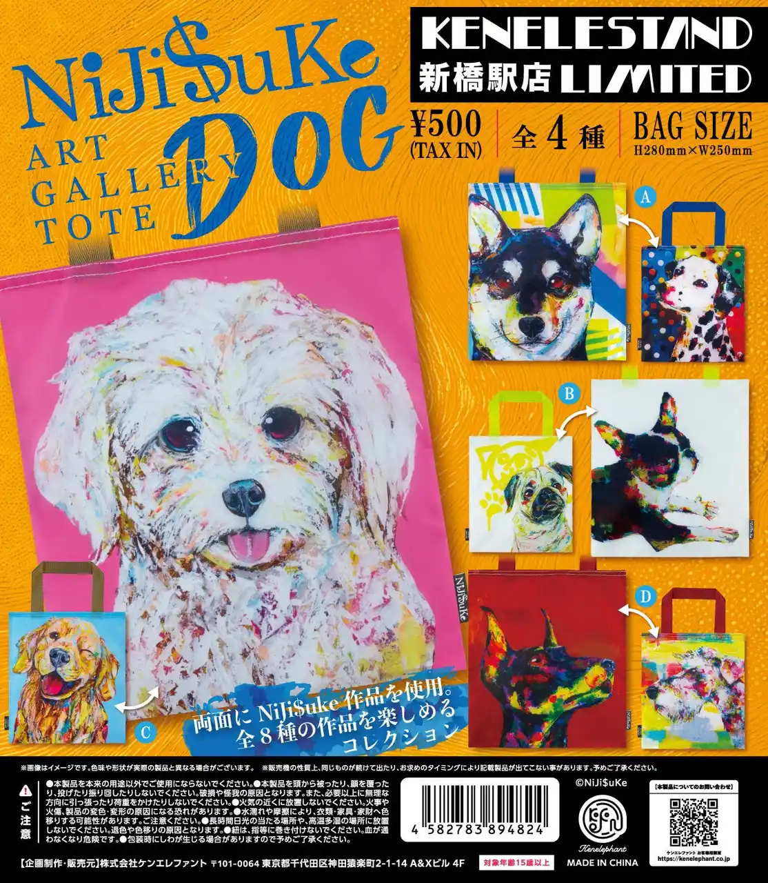 アート雑貨メーカーの株式会社ケンエレファント(本社:東京都千代田区、代表取締役社長:石山 健三)が運営するカプセルトイ専門店「KENELE STAND(以下、ケンエレスタンド) 新橋店」より、ここでしか手に入らない限定の新製品として、アーティスト・Niji$uke氏とのコラボレーションによるオリジナルのカプセルトイ第二弾となる「Niji$uke ART GALLERY TOTE CAT/DOG」を、2026年4月6日(月)より発売いたします。