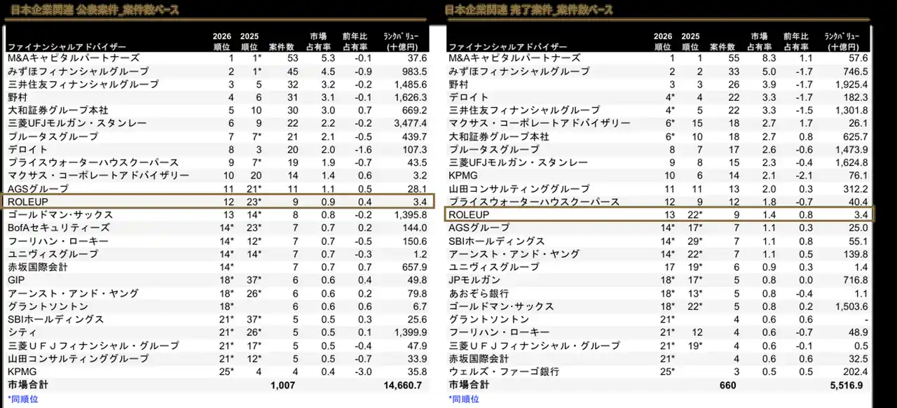 LSEG(ロンドン証券取引所グループ、旧リフィニティブ)が発表したM&A市場リーグテーブル「日本M&Aレビュー2026年(1‐3月期)フィナンシャル・アドバイザー」にて、昨年に比べ大きく飛躍し、日本企業関連公表案件数ベース12位(前年23位)、完了案件数ベース13位(前年22位)にランクインしました。 |