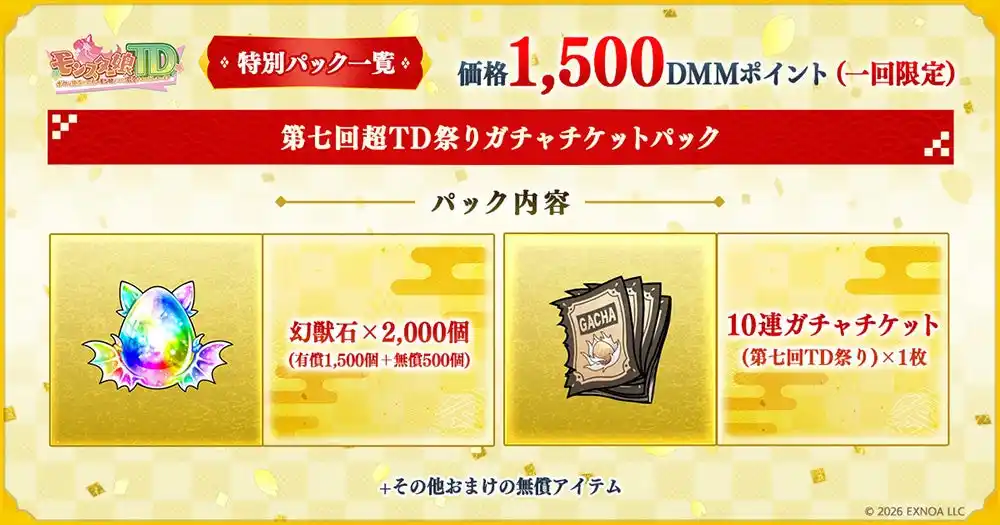 イベント開催期間中、1回限定で「幻獣石×2,000個(有償1,500個+無償500個)」や10連ガチャチケット(第七回TD祭り)×1枚などの貴重なアイテム、その他便利アイテムがパックとなった「第七回超TD祭りガチャチケットパック」(価格:1,500DMMポイント)で販売します。 |