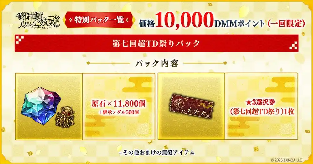 イベント開催期間中、1回限定で「原石×11,800個」「継承メダル×500個」などの貴重なアイテムやコラボガチャで登場する最高レア新キャラクターから選べるアイテム、その他便利アイテムがパックとなった「第七回超TD祭りパック」(価格:10,000DMMポイント)で販売します。 |