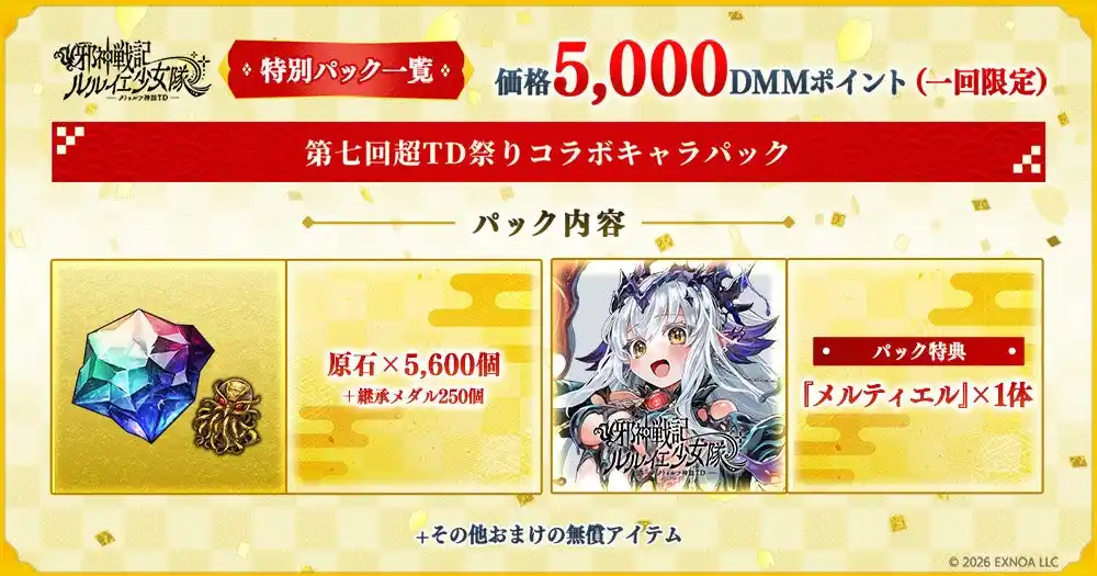 イベント開催期間中、1回限定で「原石×5,600個」「継承メダル×250個」と限定コラボキャラクター「メルティエル」、その他便利アイテムがパックとなった「第七回超TD祭りコラボキャラパック」を5,000DMMポイントで販売します。 |