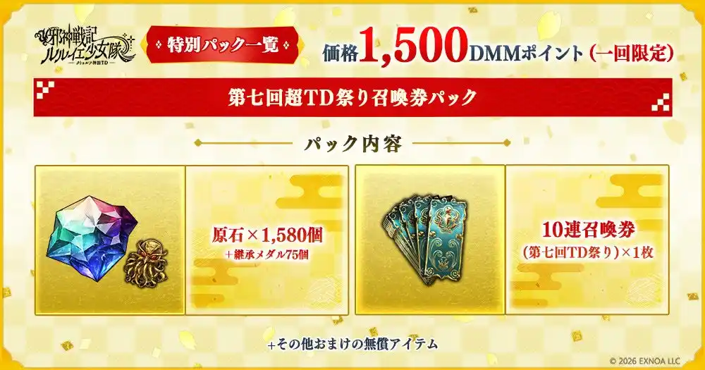イベント開催期間中、1回限定で「原石×1,580個」「継承メダル×75個」や10連召喚券(第七回TD祭り)x1枚などの貴重なアイテム、その他便利アイテムがパックとなった「第七回超TD祭り召喚券パック」(価格:1,500DMMポイント)で販売します。 |