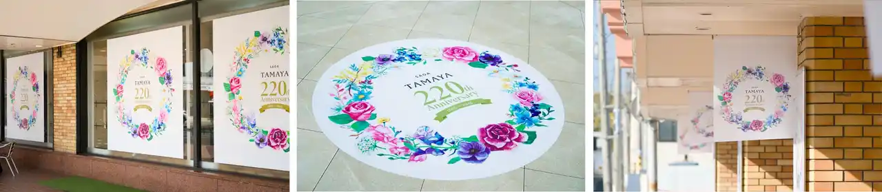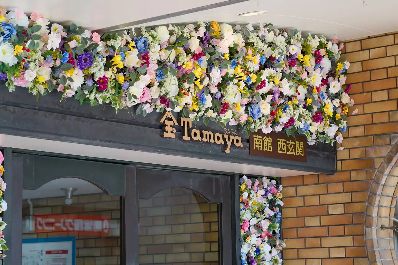 南館1階北玄関には、佐賀出身のフラワーアーティスト・松本光氏によるフラワーパネルを新設。 西玄関の装花は、220周年ロゴをモチーフにしたデザインへとリニューアルし、来館時から佐賀玉屋ならではの世界観を体感いただける空間へと進化しました。 |