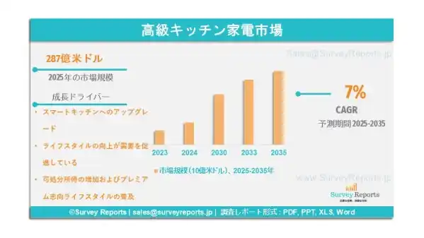 Surveyreportsの専門家による分析によれば、高級キッチン家電市場規模は2025年に287億米ドルであった。また、2035年末までに493億米ドルに達すると予測されている。さらに、同市場は2025年から2035年の予測期間において、約7%の年平均成長率(CAGR)で成長すると見込まれる。