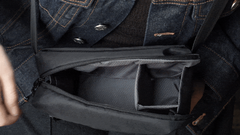 | 限界までコンパクトなパッケージにするために、「カメラのグリップを上向きに、レンズを横向きに」収納する仕様。バッグを開けた瞬間すぐにカメラを掴み、シームレスに撮影へ移行することができます。 | |||