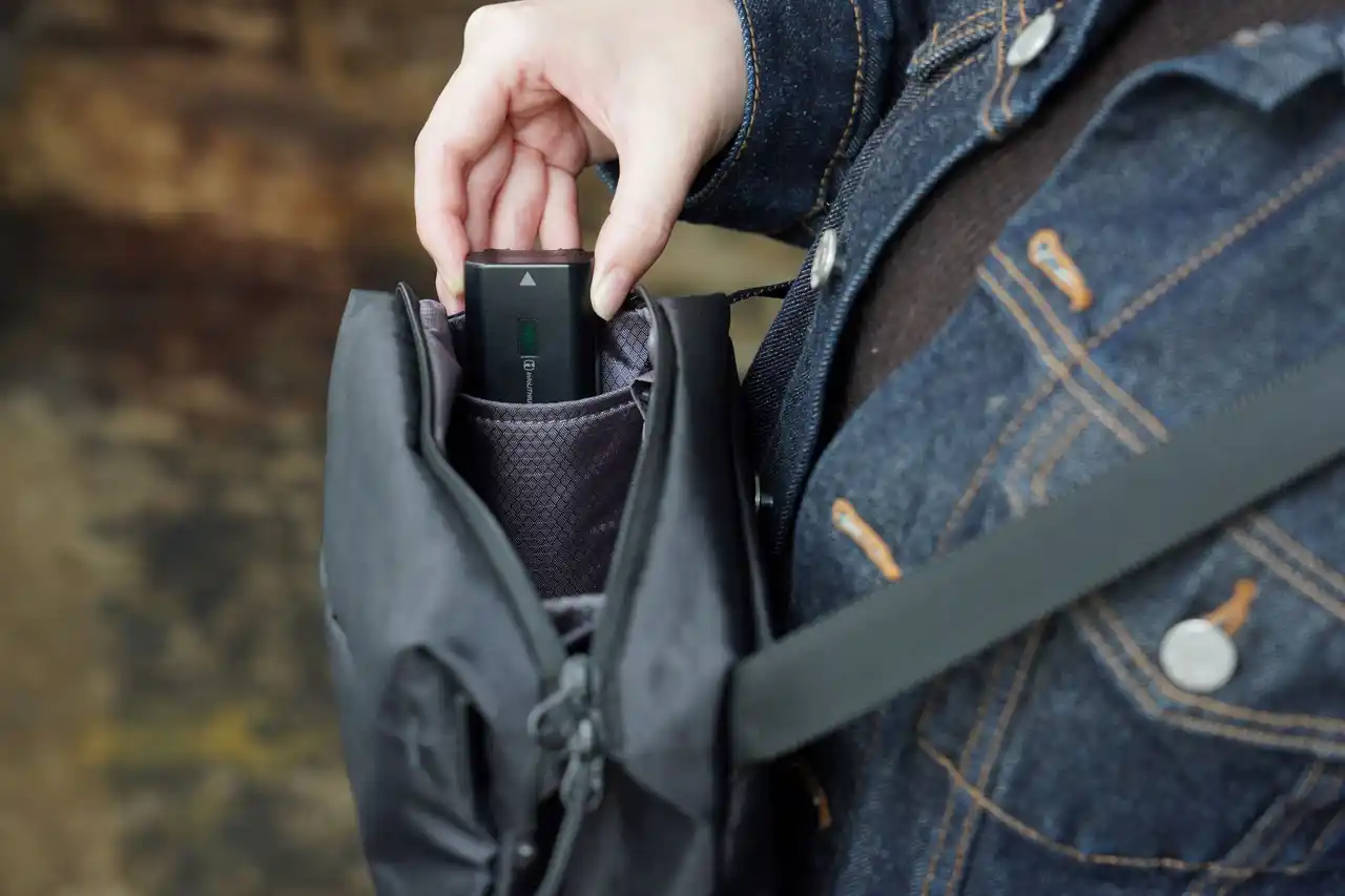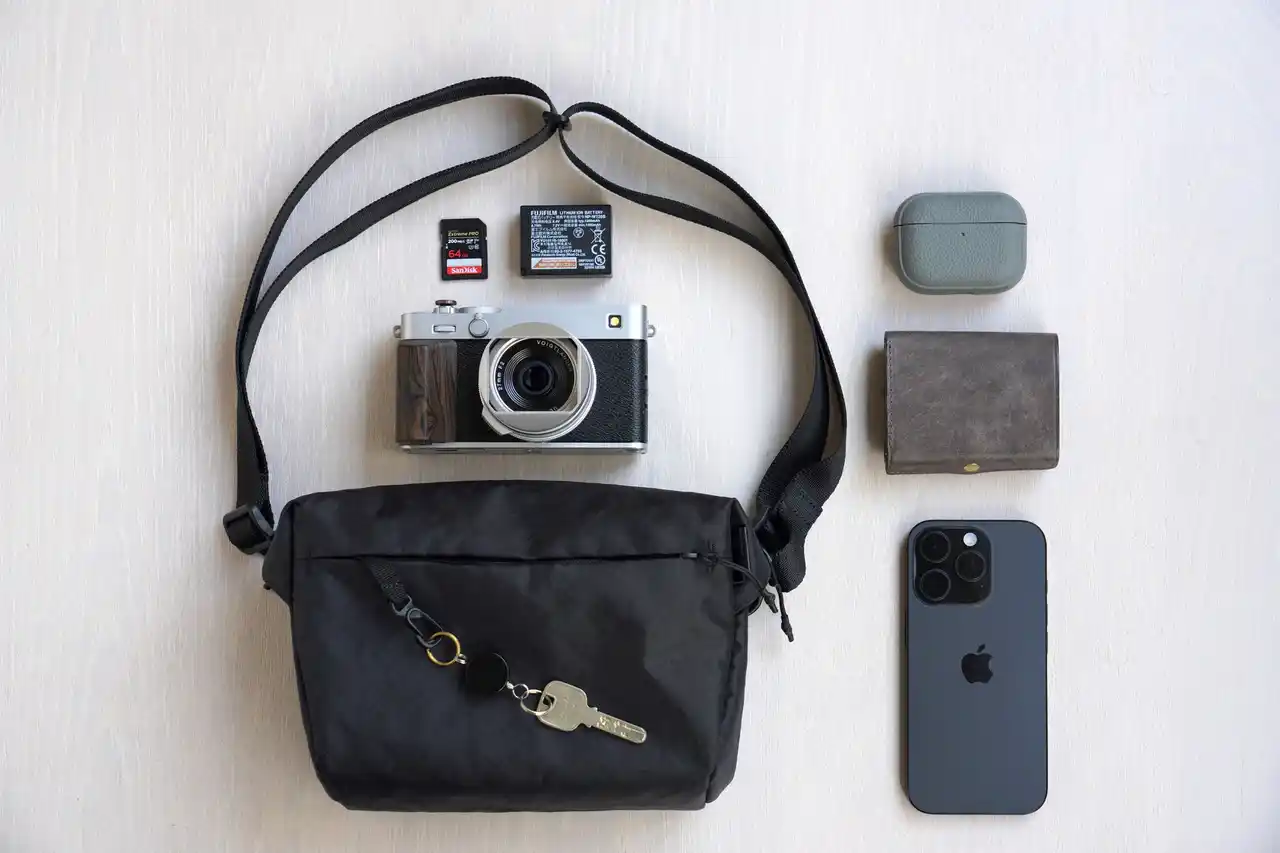 日用品とカメラを合わせたサイズが小さく、重量が軽くなるほど、持ち運びへの抵抗感が薄れ、自然とカメラを持ち出す回数が増えます。 休日の街歩きに最低限必要な、小さな財布、スマホ、家の鍵、イヤホン、そして予備バッテリーが収納可能です。 |