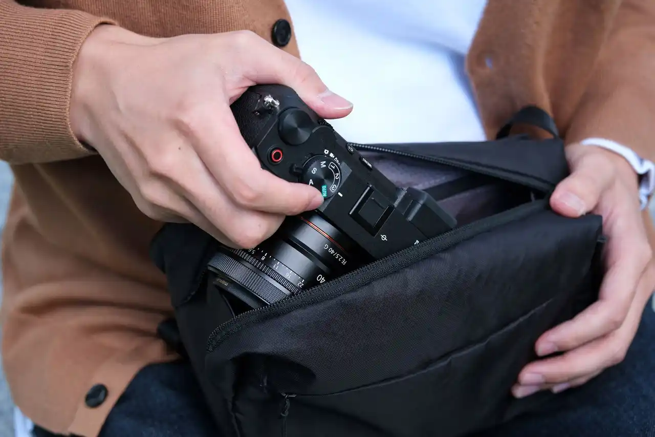 また、左右どちらか一方が大きくV字に開口する特殊な天面ジップにより、わずか2Lの小型サイズにもかかわらず、角ばってボリュームのあるカメラでも、引っかからずスムーズな出し入れが可能です。 |