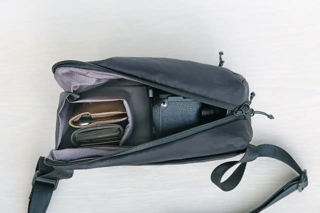 | 最低限の日用品(例:スマートフォン・ミニ財布・キーケース・ワイヤレスイヤホン)に、カメラ1台を加えて持ち歩くための超コンパクトなカメラバッグです。 | |||